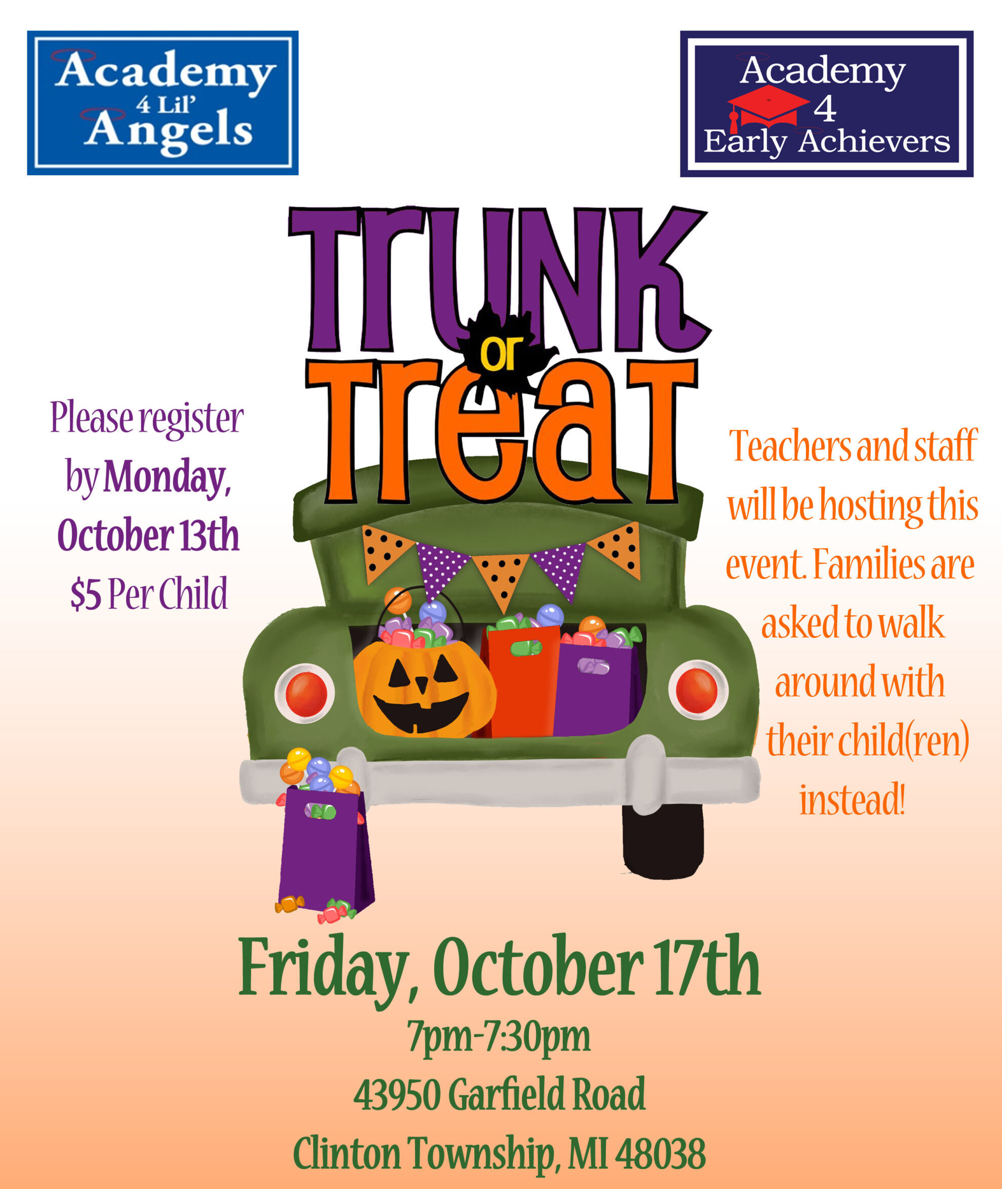 Please join us for our annual Trunk or Treat on Friday, October 17th from 7:00pm to 7:30pm.